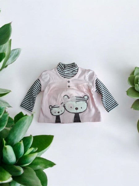 Cet ensemble audacieux pour bébé de 3 mois combine un pantalon confortable à bas élastiqué avec un double tee-shirt aux teintes rose et marron. Parfait pour offrir à votre tout-petit un look unique et une liberté de mouvement optimale.