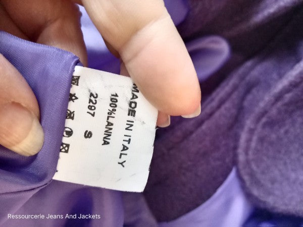 Découvrez notre manteau en laine 100%, avec un magnifique motif de fleurs sur le bas. Sa fermeture à boutons et son double col ajoutent une touche élégante à la couleur unique violet et noir. Taille 44 pour un look parfait.