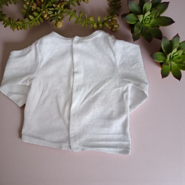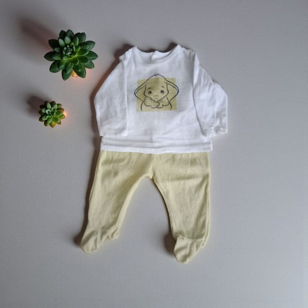 Pyjama Disney Baby deux pièces pour bébé de 12 mois, aux teintes douces blanc et vert anis. Conçu avec des pieds intégrés au bas pour plus de confort et de chaleur pendant le sommeil. Cet ensemble offre une douceur agréable à la peau délicate de votre enfant. Parfait pour les nuits paisibles, ce pyjama combine praticité et charme avec la magie Disney. Article en bon état, prêt à accompagner les rêves de votre petit.