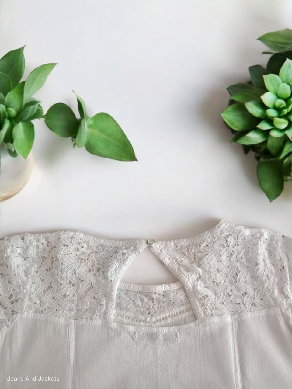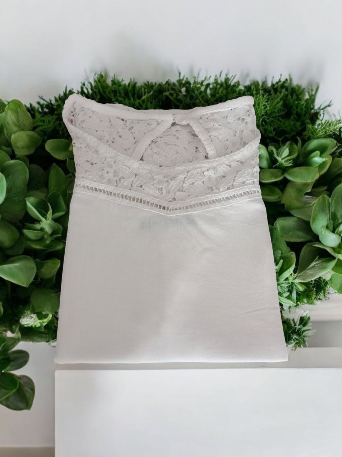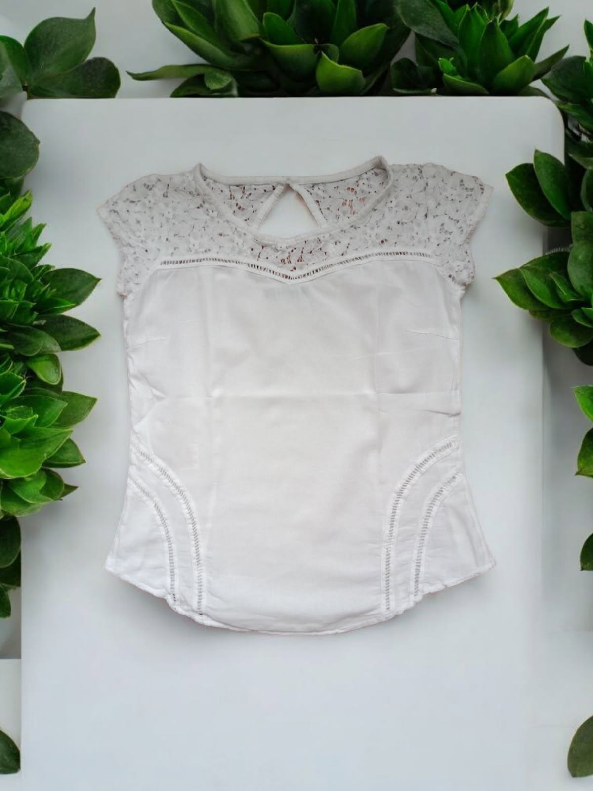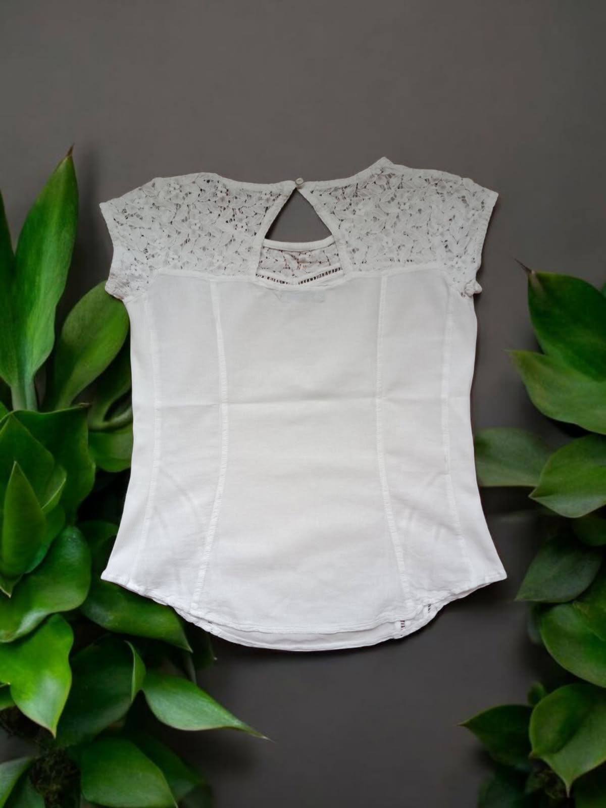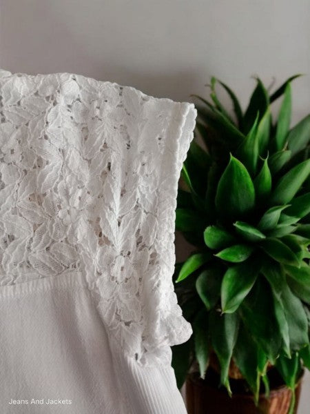 Découvrez ce top blanc à manches courtes de La Cotonnière, sublimé par un haut en dentelle délicate et un petit bouton à l'encolure arrière. Confectionné en coton de qualité, il allie confort et élégance. En parfait état, ce vêtement est l’allié idéal pour apporter une touche raffinée et intemporelle à votre garde-robe. Ne passez pas à côté de cette pièce incontournable.